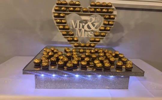 We had the whole package, photo backdrop (absolutely beautiful and dressed in our colour theme), sweet table, Ferraro Roche’s heart, video post box, magic mirror with guest book, and disco.